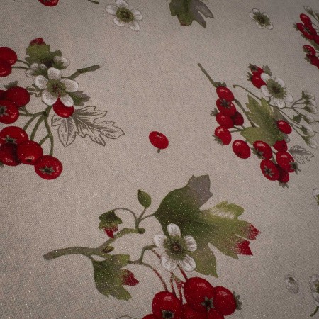 Tejido de mantelería navideña con fondo blanco , detalles brillantes de lurex plateado y estampado de grosellas rojas . Perfecto para mesas...