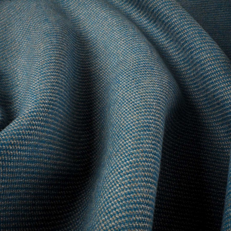 Tejido sastrero de estilo clásico con dibujo de fantasía en tonos azul petróleo y beige. Ideal para blazers, chaquetas, trajes y prendas de confección elegante con un toque atemporal.