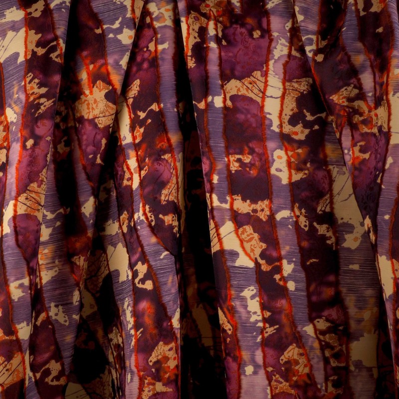 Tejido de jacquard con técnica fil coupé, diseño abstracto en tonos tierra, malva, granates y toques naranja. Perfecto para prendas únicas de moda