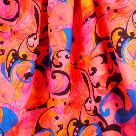 Tela crepe estampado en tonos calidos muy bonita y de colores muy vivos. El crepe es una tela con mucho vuelo y caída, y textura con cierta rugosidad, característica principal del crepe. Tejido estampado para la confección de vestidos con vuelo, faldas y blusas, así como todo tipo de prendas de moda.Tela crepe de poliéster muy fácil de confección de conservación.
