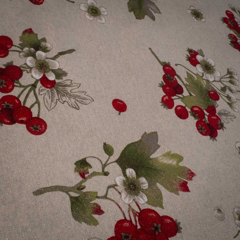 Tejido de mantelería navideña con fondo blanco, detalles brillantes de lurex plateado y estampado de grosellas rojas. Perfecto para mesas festivas, decoración y confección de hogar.